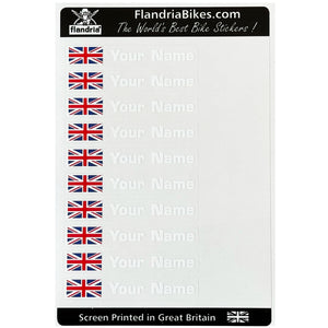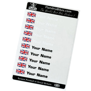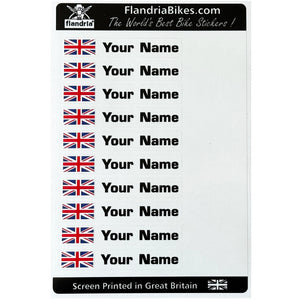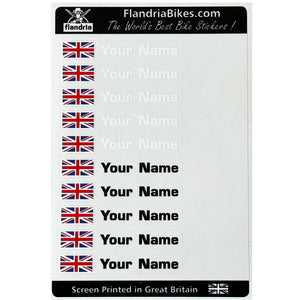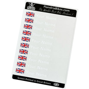 Custom printed name sticker with your Country Flag. These are printed on a clear background for a super-clean look! Show your national pride and let people know where you are from. Great for bicycle frames but can also be used for many other applications.